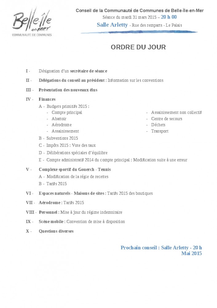 Conseil Communauté de Communes de Belle Ile du 31 mars 2015